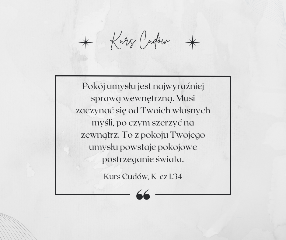 „Pokój umysłu jest najwyraźniej sprawą wewnętrzną. Musi zaczynać się od Twoich własnych myśli, po czym szerzyć na zewnątrz. To z pokoju Twojego umysłu powstaje pokojowe postrzeganie świata” (Kurs cudów, K-cz. 1. 34.)